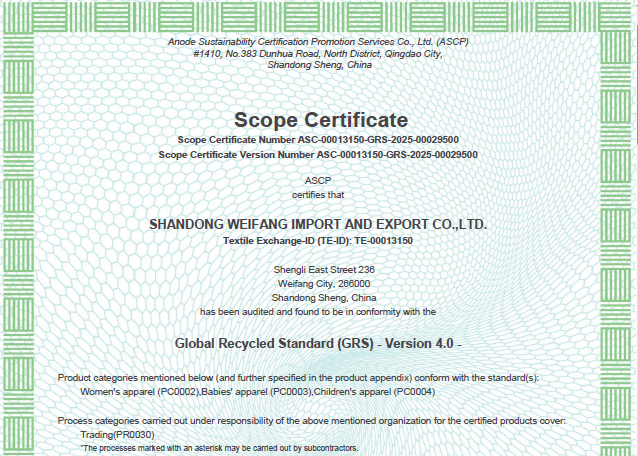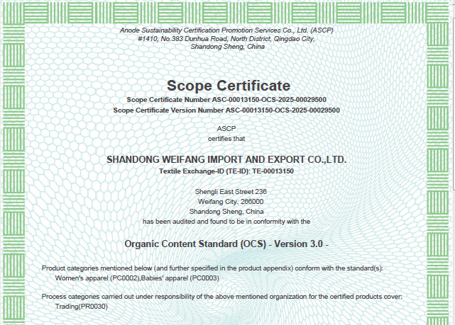 公司自營和代理服裝、食品、五金、化工、機(jī)電等各類商品及技術(shù)的進(jìn)出口業(yè)務(wù),公司有專門的生產(chǎn)、加工基地,并通過了Oeko - Tex Standard 100、GRS、OCS、RCS、USCTP等多項(xiàng)認(rèn)證,可以按客戶要求設(shè)計(jì)生產(chǎn),同時(shí)承辦中外合資經(jīng)營、合作生產(chǎn)、開展“三來一補(bǔ)”以及技術(shù)輸出、易貨、邊境貿(mào)易等業(yè)務(wù)。公司產(chǎn)品出口到日本、法國、俄羅斯等50多個(gè)國家或地區(qū)。